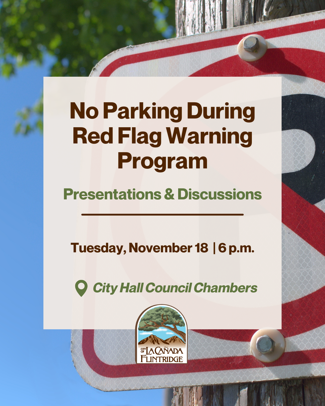 At its regularly scheduled meeting on November 18, the La Cañada Flintridge City Council approved a “No Parking During Red Flag Warnings” program on select streets in the City, following community town hall discussions held earlier this year. Similar to programs adopted by Pasadena in 2009 and Los Angeles in 2006, La Cañada Flintridge will restrict parking on select streets when the National Weather Service determines there is a combination of dry fuels and weather conditions that support extreme fire danger.